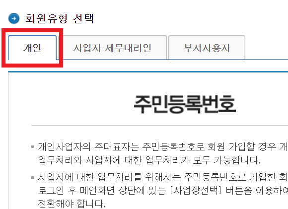 개인사업자, 개인은 [개인]을 선택해야 합니다.