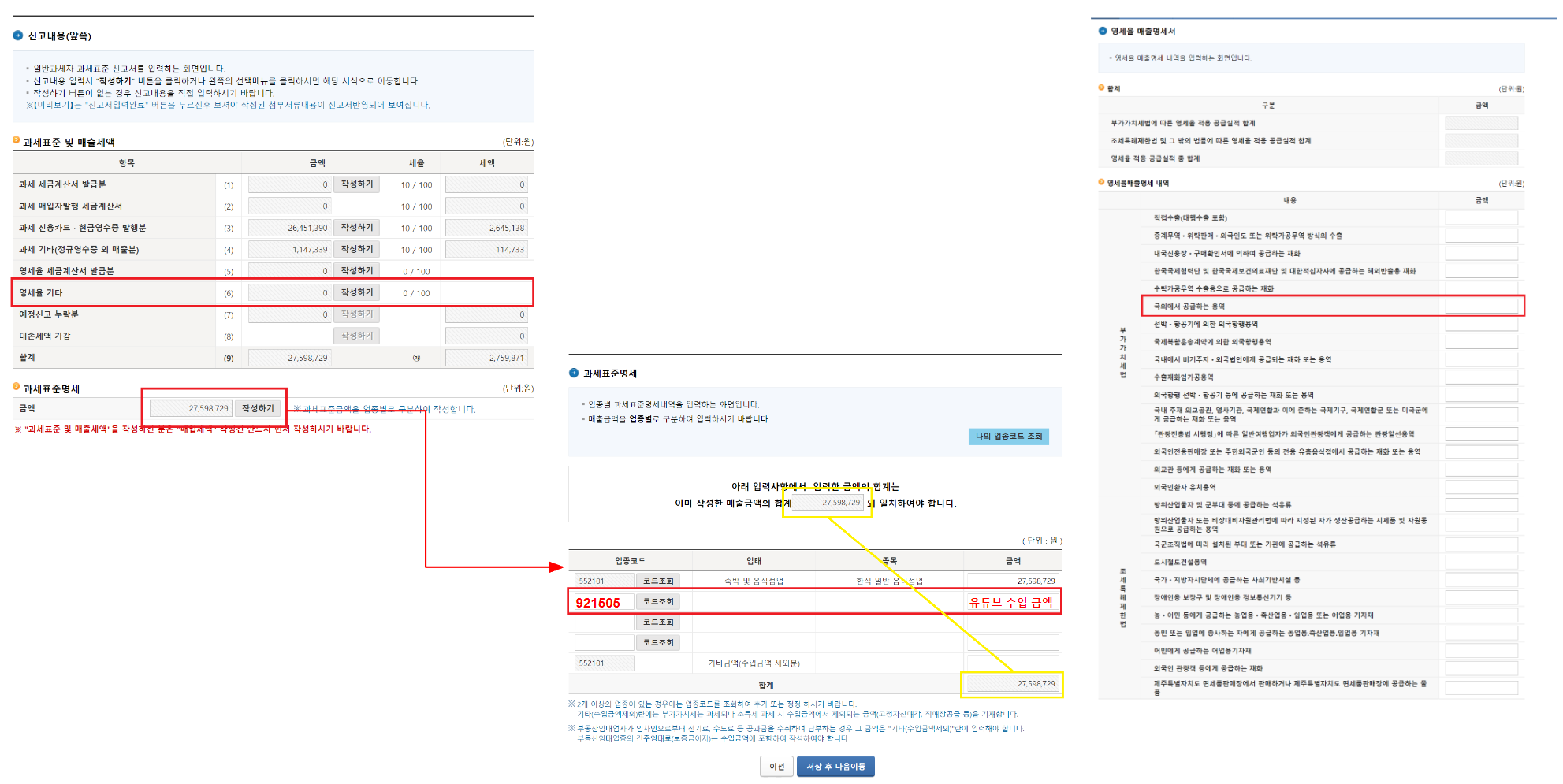 7. 과세표준명세 업종코드 조회하고 유튜브 수입 금액 입력