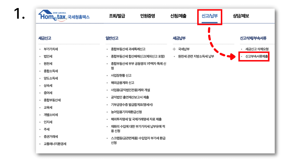 1. PC 홈택스에 로그인하고 [신고/납부] 클릭 > [신고 부속서류] 제출 클릭